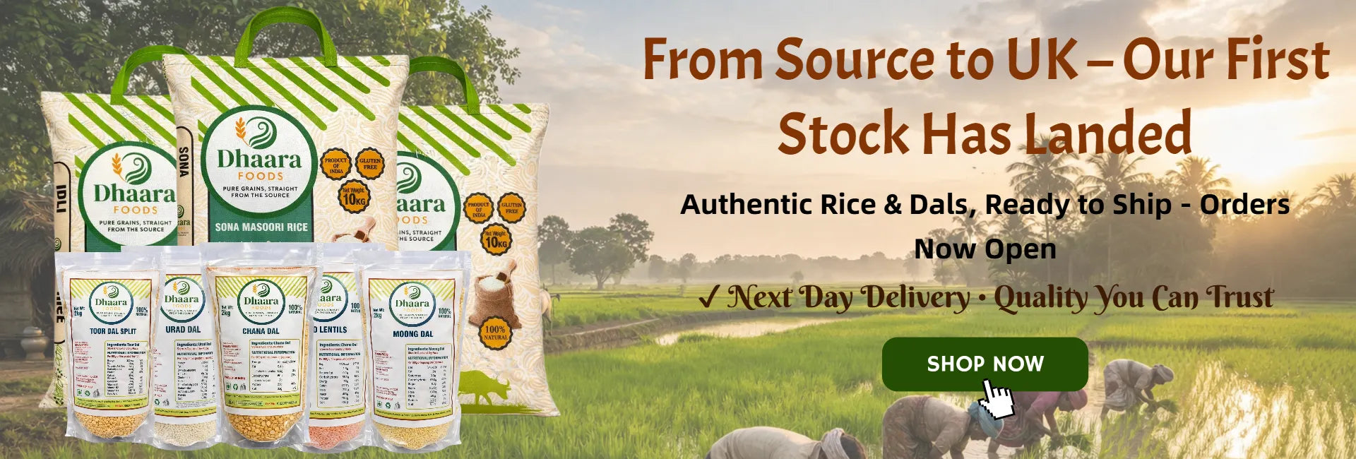 Dhaara Foods brings you premium Indian rice and pulses — Sona Masoori, Idly, Ponni, Kerala Matta, Toor Dal, Urad Dal, Chana Dal and more. Directly sourced from trusted mills and packed fresh to ensure authentic taste, nutrition, and quality in every meal.