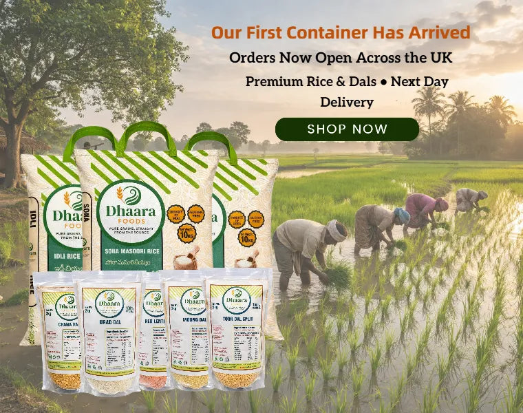 Dhaara Foods brings authentic Indian groceries directly to homes across the United Kingdom. Our carefully selected range includes premium Indian rice, traditional dals and lentils, spices, tea, coffee and everyday pantry essentials used in South Indian and North Indian cooking.